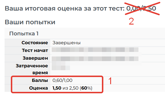 Обратите внимание: имеют значения только показатели «Баллы» и «Оценка» внизу рисунка (1), показатель «Ваша итоговая оценка за этот тест» (2), который на рисунке зачёркнут, следует игнорировать.